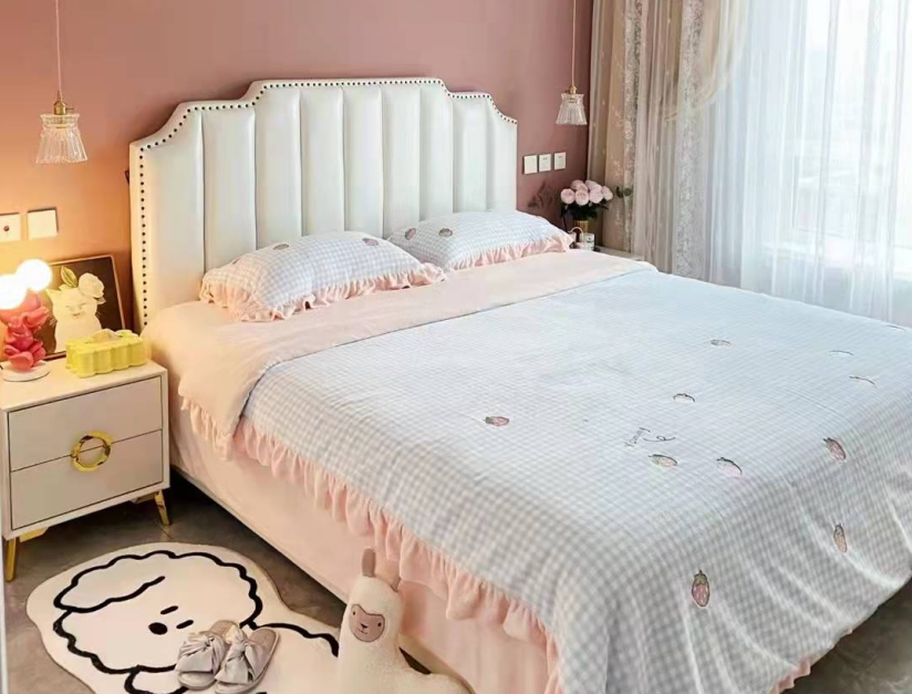 空间以粉色为主旋律,淡粉床单搭配墙面,营造出满室温馨氛围,与整体空间和谐相融。