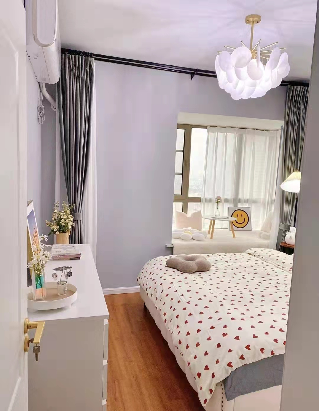 以吊灯为核心,辅以床头灯与台灯,空间熠熠生辉,宛若梦幻童话之境。
