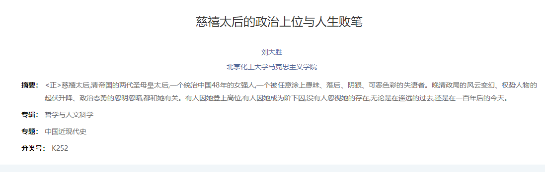 中国知网 [1]刘大胜.慈禧太后的政治上位与人生败笔[J].文史天地,2020,(03):51-55.