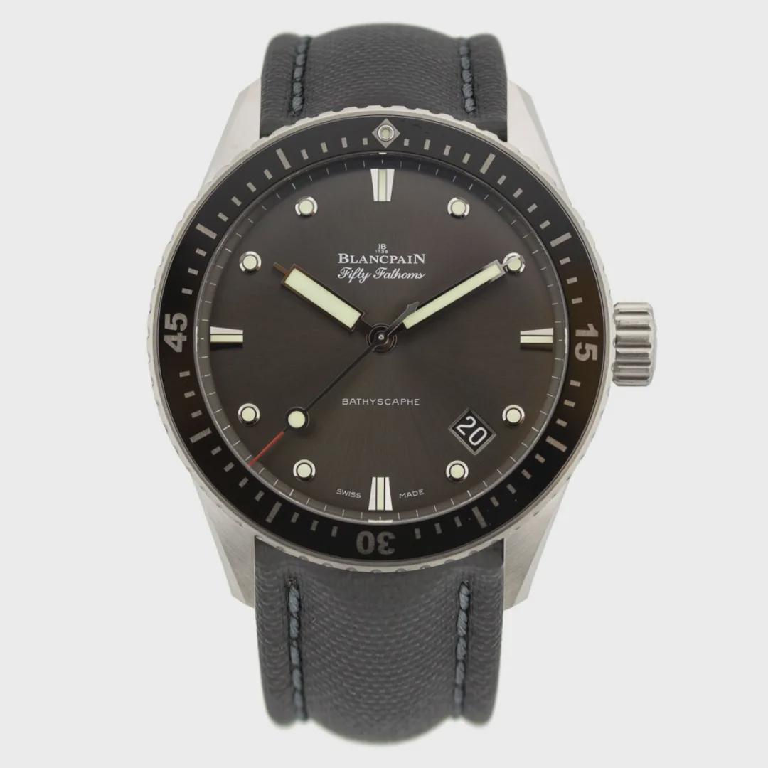 这是一枚宝珀五十噚系列5000-1110-B52A腕表,这枚腕表搭载自动机械机芯,表壳为缎面磨砂精钢材质,航海帆布表带,具有日期显示功能,表径43毫米,防水300米,参考价格77500元(以实际价格为准)。
