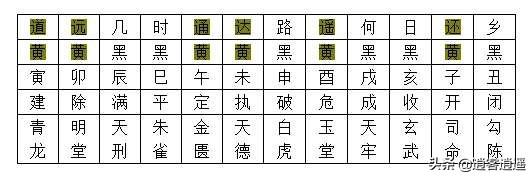 道教把黄黑道用于牌位、章表的书写上时,有一套与俗不同的秘传歌诀,曰“道远几时通达,路遥何日还乡”。计算的时候,从文疏的最右侧一行开始计算,逐行向左数,凡是落在带有“走之底”的行数上,此行便是黄道。在这句歌诀中,“道、远、通、达、遥、还”这几个字都是“走之旁”,所以在计算的时候这几个字落在哪一行上,那么这一行所属便是黄道。