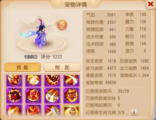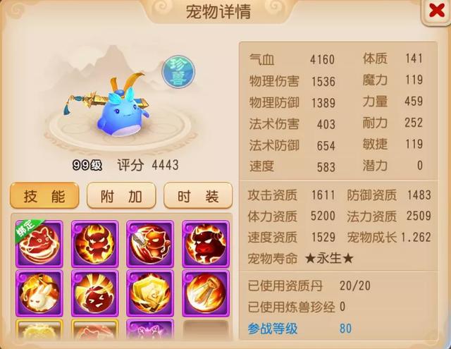由于是12技能宠物,技能搭配就更加全面,高级招架使它生存能力更进一步,高级敏捷则让它每回合都能率先出手。