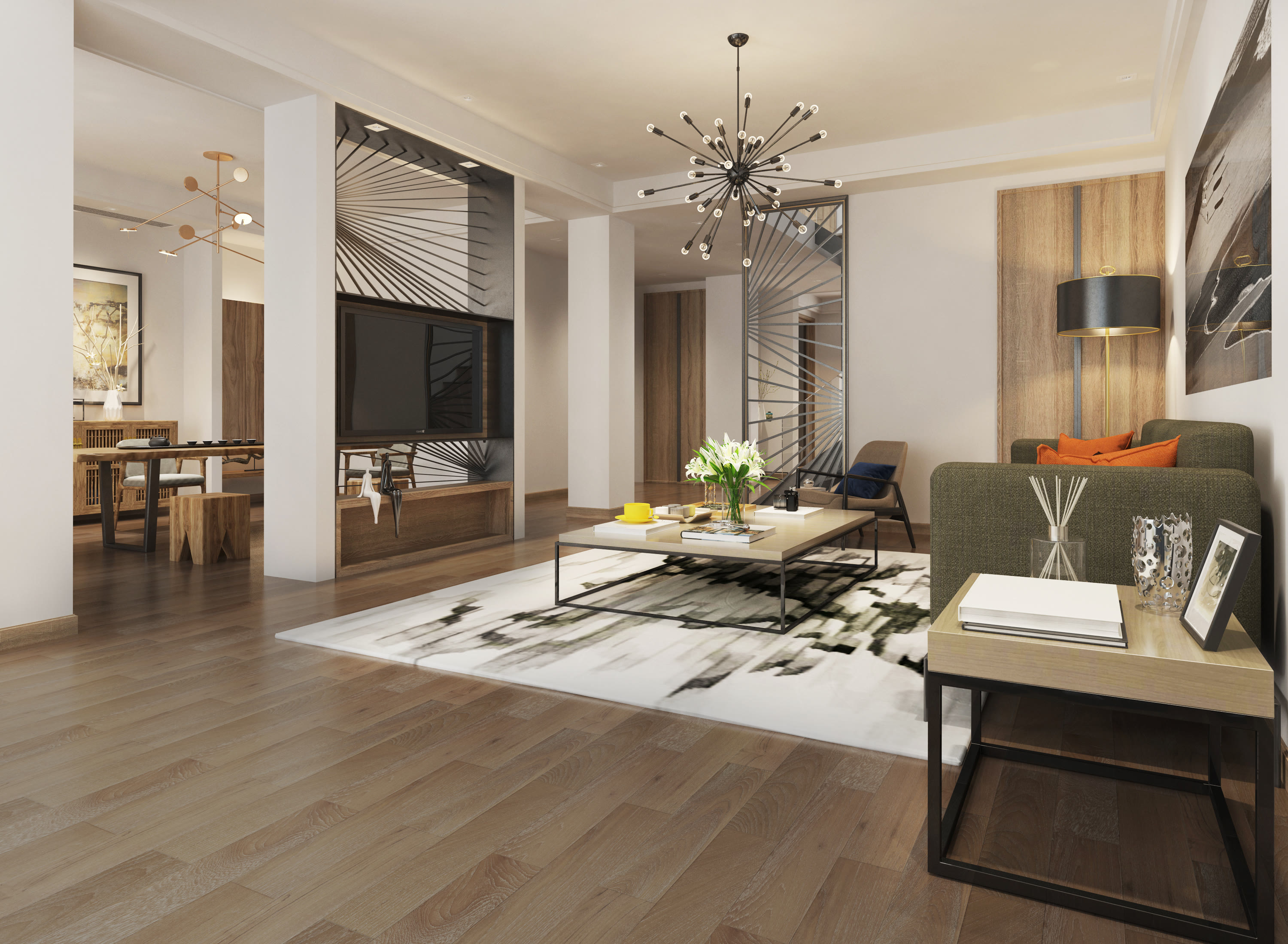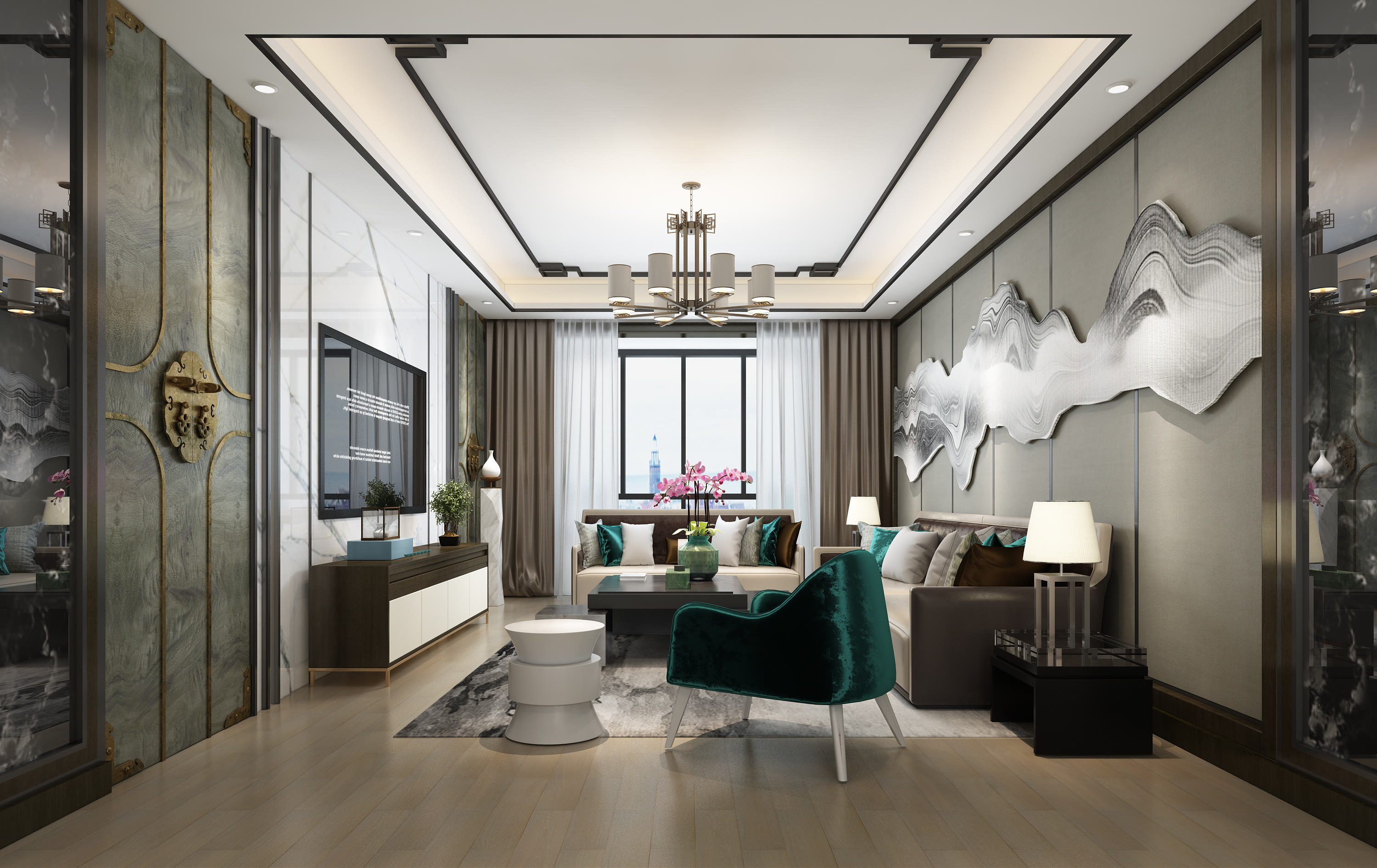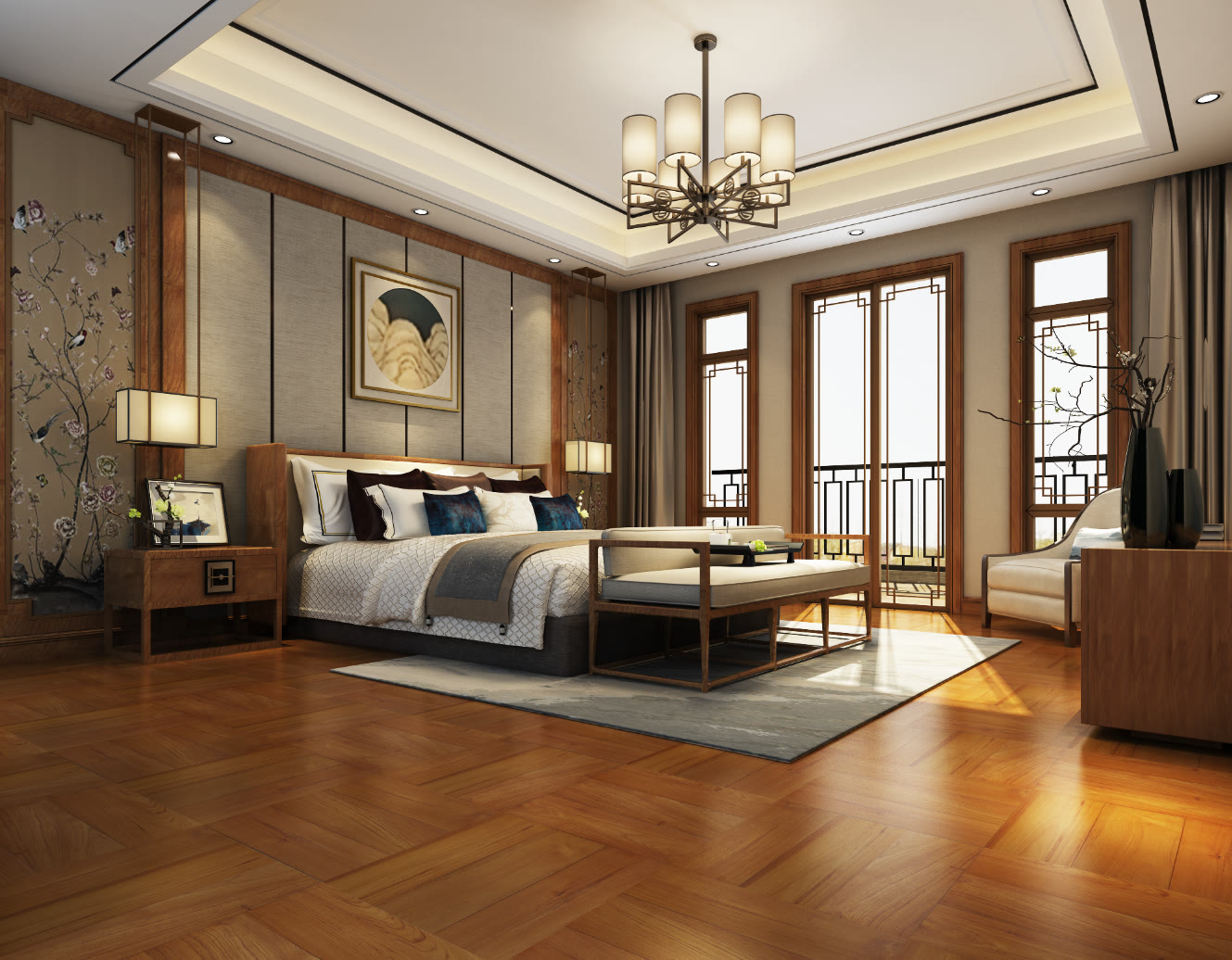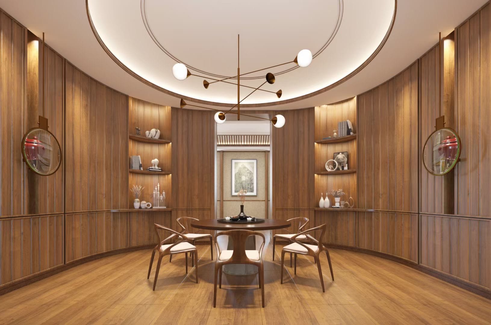 人文美学与儒雅精致是新中式风的精髓,设计上选用带有天然纹路的材质为主。新中式不是大开大合、浓墨重彩,而且润物细无声。适合有纹理,带墨线的地板,如黑金线、水波纹、直纹、山纹等,传达了主人独一无二的品味,既有现代艺术感与科技感,又能体现东方文化意涵。