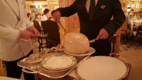 等后厨忙活半天后,服务生会倒数三二一,戳破胀得气球大的猪膀胱,掏出里面的鸡,切块、淋汁儿、装盘。