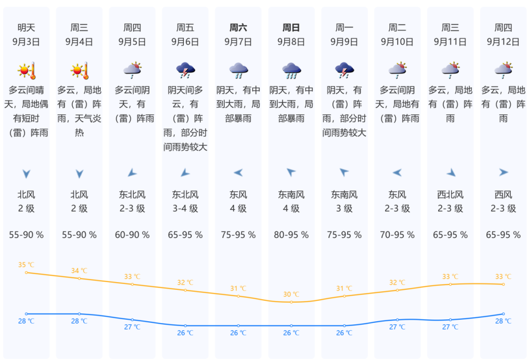 ⛅3日多云间晴天,局地有短时雷阵雨,气温28-35℃,中、北部和人口密集区最高气温37℃左右;