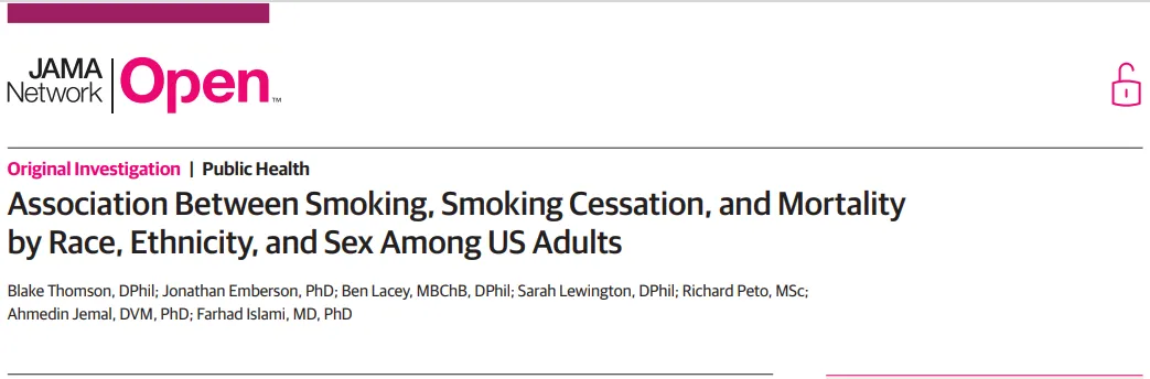 美国癌症协会和牛津大学的研究人员发表在《JAMA Network Open》上的一项研究,通过对超55万美国成年人调查发现,吸烟者的全因死亡风险要比不吸烟者高出180%,而尽早戒烟能降低死亡风险。