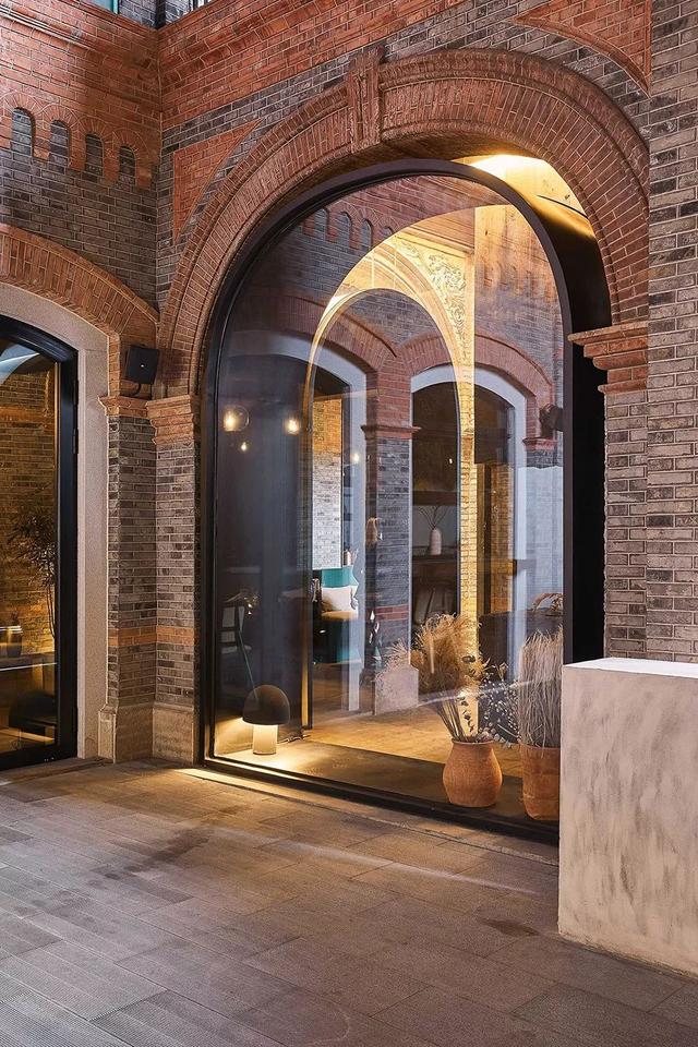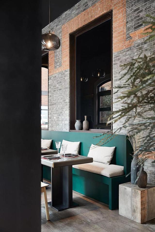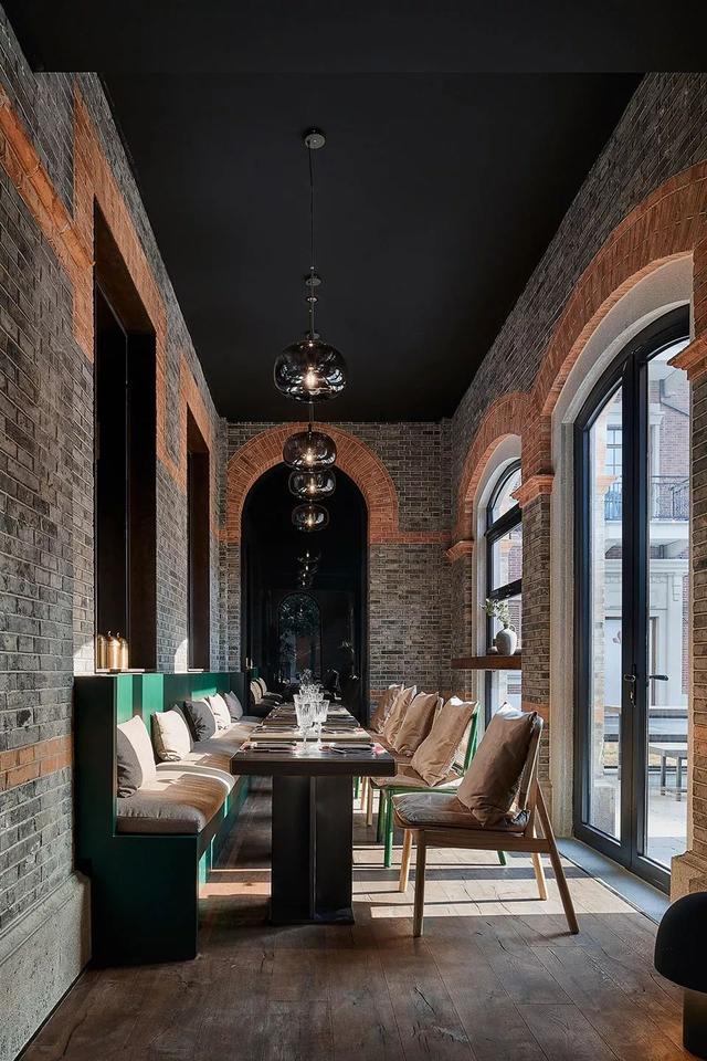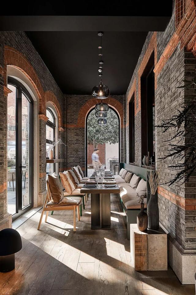 ▼玄廊餐吧,保留了原建筑门廊立面的砖墙 ©张大齐