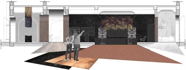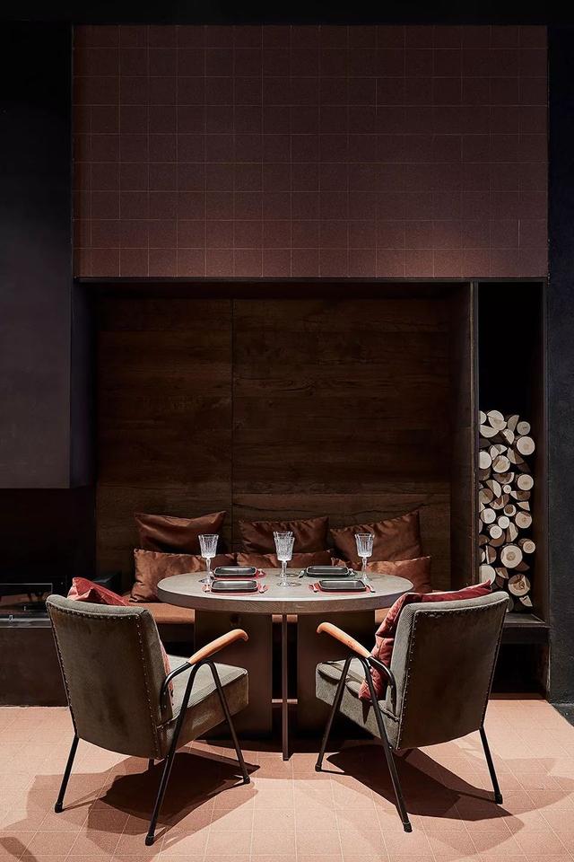 穿过主厅来到后室,“灰烬”的空间为灰白色,透过靠近尽头的墙边的灰,再次隐约可见原建筑砖墙。餐吧中间的由西至东,温度轴连接厨房、吧台,由代表火的红色地砖连接餐饮空间西墙的壁炉。
