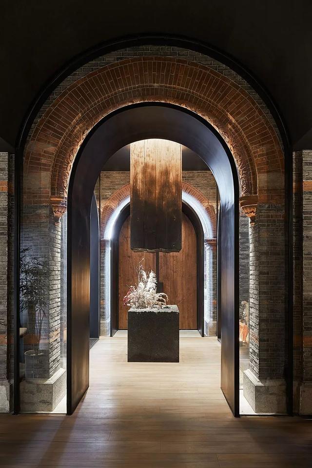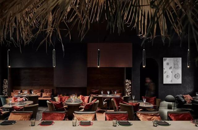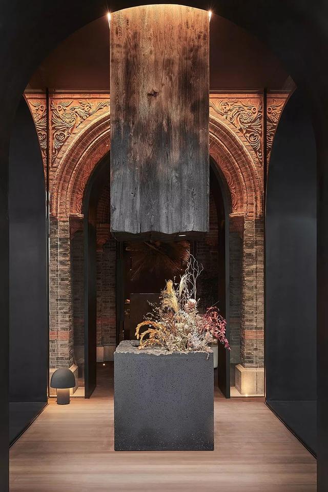 绕过迎客图腾来到第一个餐吧空间-玄廊,木地板和穿插的绿色家具代表了“木”的森林概念,八荒设计保留了原建筑门廊立面的砖墙。然后来到主厅,这里是“木”燃烧至“碳”的空间,因此所有地面和墙面都转变成炭黑色。