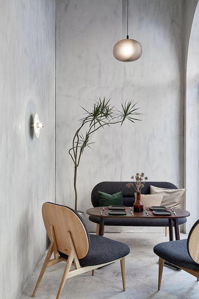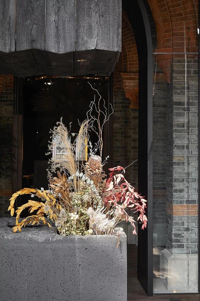 为了加强每一个用餐区域的概念,八荒利用灯光、道具和装置,精心打造每个区域的氛围。“木”玄廊面对丰盛里广场,阳关透过植物,洒在原建筑砖墙上,树影婆娑。“碳”主厅的墙面和地面虽是黑色,但都有随着光影变化的粗糙肌理。
