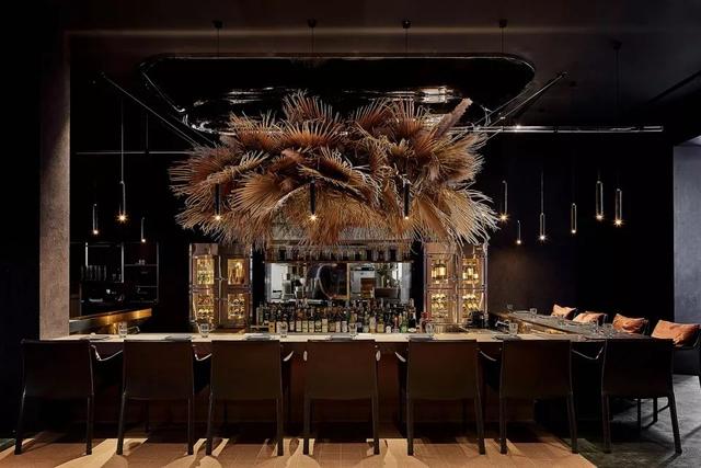 在吧台正中时间轴与温度轴交叉的位置,八荒设计亲手制作了预示着餐饮盛宴的大型蒲葵装置,再由天花的镜面穹顶反射延伸,仿佛悬挂于天空。与之呼应的“灰烬”后室中心的小镜面穹顶下则悬挂了预示重生的芭蕉叶和尤加利果装置。