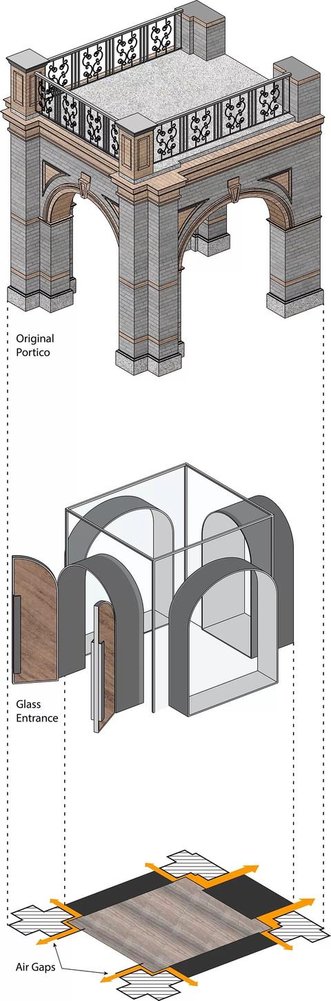 ▼餐吧入口轴测,采用与整个建筑立面完全分离的独立钢结构、玻璃系统©八荒设计