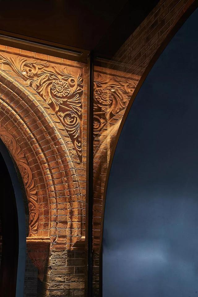 考虑到CHARCOHOL项目所在建筑的历史性,八荒希望最大程度地尊重和保留原建筑。在将原半室外的玄关及门廊空间改为室内用餐空间的改造过程中,为了避免破坏原建筑立面的装饰,八荒设计了与整个建筑立面完全分离的独立钢结构、玻璃系统,非但没有触碰原建筑立面,还从门廊内侧通过巧妙的灯光点缀,向博物馆一样着重勾勒突出了建筑的美。
