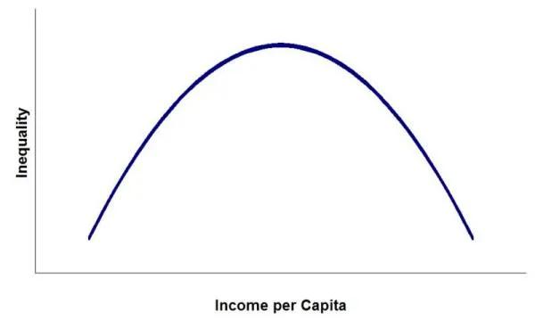 另一位俄罗斯经济学家是库兹涅茨,出名的贡献是“库兹涅茨曲线”。曲线的横轴变量是人均国民生产总值,纵轴是收入不平等程度,曲线是一个倒U形。换句话说,就是随着经济的增长特别是人均收入的增长,财富分配不平等的程度会降低,世界将越来越美好。