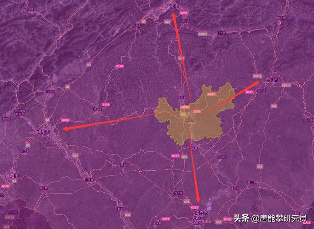 阆中的东西方向分别为巴中和绵阳,南北方向分别为广元和南充,相对来说,离巴中最近,离南充次之。但是巴中属于远离成都和重庆的方向,因此阆中主要是经南边的南充到成都或重庆,和西边的绵阳接触也比较频繁。