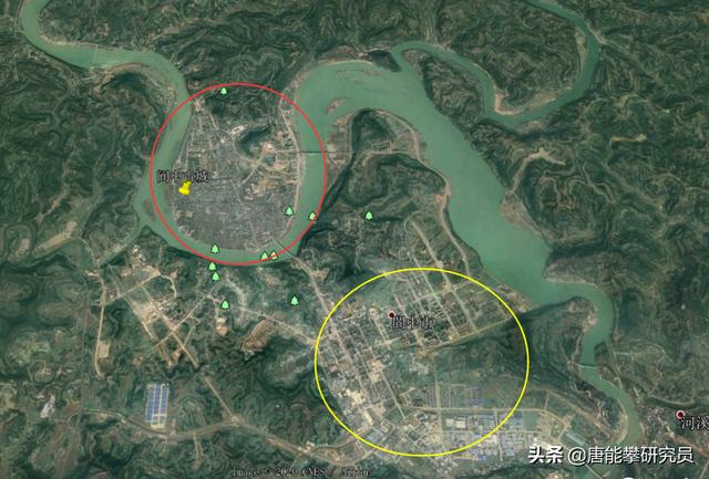 上图中,红色圆圈内为阆中古城,黄色圆圈为阆中新城。