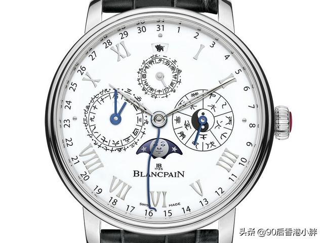 白色大明火珐琅表盘,12点是「生肖年份」窗口,己亥年是一只野猪的剪影,12点下方是以「地支」计算的十二时辰盘。3点小表盘显示「天干」和阴阳五行,6点为月相盘,9点是农历月份日期和闰月公历的日期则由一枚蛇形中央指针指示。