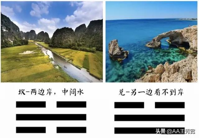 兑卦「☱」只有一边有阴爻,一边是岸,另一边都是水,一望无际,看不到岸,这就是湖泊、是大海的形象。