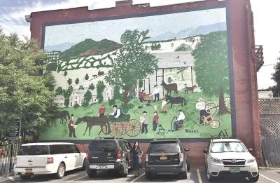 胡西克福尔思(HoosickFall)镇上的停车场,墙上有当地艺术家重绘的摩西奶奶代表作(2018年8月,StephenGallira摄)