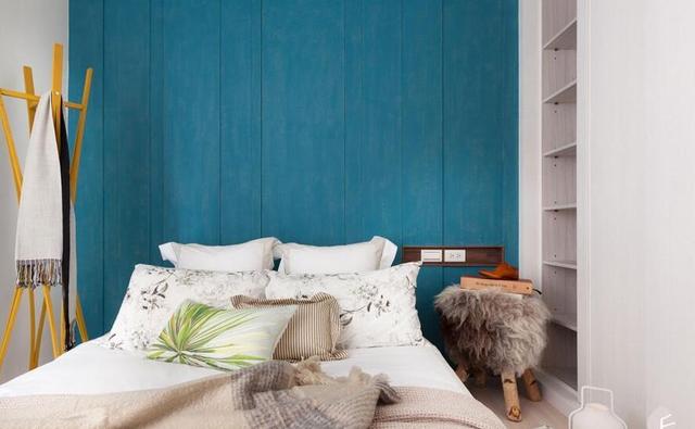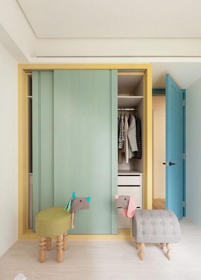 深蓝色卧室背景墙与嫩黄色床尾到顶衣柜形成鲜明对比,有对比才有突出。同时卧室注重了收纳与电视机的隐藏功能,当需打开电视机,即将白色柜门挪移关闭,里面可悬挂衣物及储物。毛茸茸的床头边凳像极了会走动的小毛物,给卧室增添了动感。