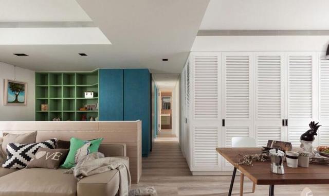 将入户门漆成蓝色,与鞋柜的鼠尾草绿登对相搭,跨门即见彩。