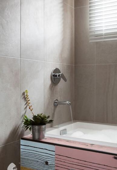 卫浴空间更是充满了马卡龙七彩色,五彩缤纷,绚丽多彩。一个面盆立面,各种色彩交互排列,像极了七仙女的七彩织锦。即使入厕,也能饱眼福,饱色。
