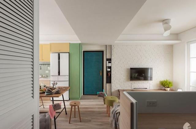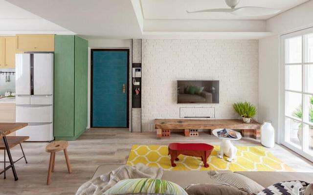 沙发背景用一低矮隔断将开敞式书房与客厅自然形成分区,书架的鼠尾草绿色和蓝色与玄关入户门和鞋柜色彩相映衬呼应。客厅再辅以菜花黄地毯、亮黄色边几、红色茶几、白色文化石电视墙面,以及三两盆绿植散落边角搭配,一个明亮而清新的客厅便组构了一家子饱色的彩度空间。