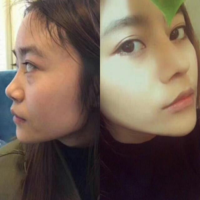 2鼻梁过高:正常的鼻根点的位置应该在眉毛和眼睛中点偏上的位置,鼻额角135度。如果鼻根部垫的过高,鼻根点上移,看上去像通天鼻,显得凶悍,失去女性的柔美。