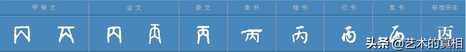 丙,象形字。“丙”最早见于商代甲骨文,如图1所示,甲骨文“丙”字像鱼尾,郭沫若《甲骨文字研究・释支干》说:“按甲、乙、丙、丁四字为一系统,乃最古之象形文字。《尔雅・释鱼》曰:‘鱼枕谓之丁,鱼肠谓之乙,鱼尾谓之丙。’乙之象鱼肠,丙之象鱼尾,可无庸说。”“丙”为鱼尾的象形。西周金文曾有一种中间填满的写法,如图2,颇为古拙,但并未进入主流。春秋时期出现另一种异体,在中间人字形的两侧添加饰笔,如图3,至战国时期楚系文字,如图4,是最为繁复的写法,为后世所不取。但秦代文字在继承西周金文的基础上,或作图7的“丙”,或作图6的“丙”,从此定了型。汉代隶书分别延续了这两种构形,楷书则选择了整体性更强的前者。