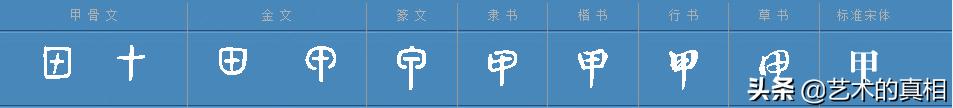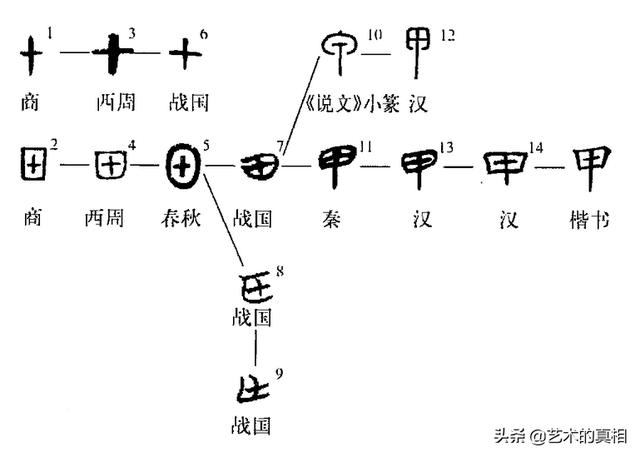 甲,最早见于甲骨文,其本义是指种籽萌芽后,所戴的种壳;也像动物身上起保护作用的硬壳,其上常有交错的纹路,或由鳞片连缀而成。“甲”的字形在甲骨文中最初有两种写法,如图1和图2。二字最初有别,后者用于“上甲”之类的人名,前者用于干支。图1的“甲”字其形容易与“十”字混淆,于是后来多借图2字形来表干支,以至于图1这种写法到战国以后即不传。“甲”字在战国楚系文字中有两种异体,如图8和图9,但这两种异体字随着楚国的灭亡而消失了。秦系文字(图11)将中间一竖拉长作“甲”,此后沿袭这种形体,隶变后楷书写作“甲”。