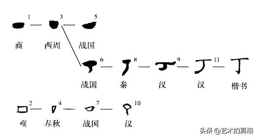 丁,象形字。最早见于商代甲骨文,有中空(图2)与填实(图1)两种写法,像钉帽的俯视图。在战国及西汉时分别出现像侧视图的写法,如图6和图10,以后,古篆把锭的圆头保留,把锭的下部拉长,变成钉子形状。到秦代小篆则更将字讹变为图8,完全失去原状。此后二者合流,将上面像钉帽的部分简化成一横,钉脚变成竖弯钩,就是今天见到的楷书“丁” [2] 。“丁”本是“钉”的初文。后来因为把“丁”用作“天干”——古代十个表示数序(甲、乙、丙、丁、戊、己、庚、辛、王、癸)的第四位;故此又另造了个以“金”旁表意,以“丁”旁表音的形声字“钉”。“丁”,原是铜锭形。金属是坚实的,故从“丁”引申出“壮健”之意,古代把成年的壮健的男子叫作“壮丁”。又引申出“人口”(如“添丁”)和指某些专职服务的人(如“园丁”、“庖丁”)