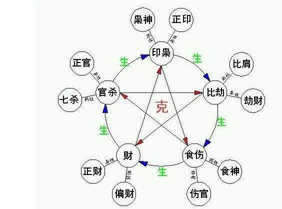 如甲为日主:生日干者,异性为正印,癸生甲;同性为偏印,壬生甲;助日干者,同性为比肩,异性为劫财;泄日干者,同性为食神,甲生丙;异性为伤官,甲生丁;耗日干者,异性为正财,甲克己;同性为偏财,甲克戊;克日干者,异性为正官,辛克甲;同性为七杀,庚克甲。因此正官,正印,劫财,伤官,正财,是与日干阴阳相反的;七杀(偏官),偏印(枭神,枭印,倒食),比肩,食神,偏财是与日干阴阳相同的。