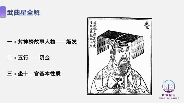 从五行上来讲,武曲星属阴金。金就有内敛的属性,所以武曲星的人,一般都比较低调内敛,不会非常的外向。而阴金又是深埋于地下的黄金,需要辛苦的挖掘,开发,才能被发现展露光芒,所以一般我们都讲,武曲星坐命的人是晚发的格局,早年一般都是会比较辛苦的,这个我们从封神榜里姬发的发展历程我们也可以看的出来,早年姬发并不是像他大哥那样光芒万丈,是很低调的,但是后期他非常的务实,也非常的勇敢,最后也打败了纣王,所以我们也可以看出来武曲星坐命的人有务实的一面,一般都不会非常的天马行空,比较踏实。