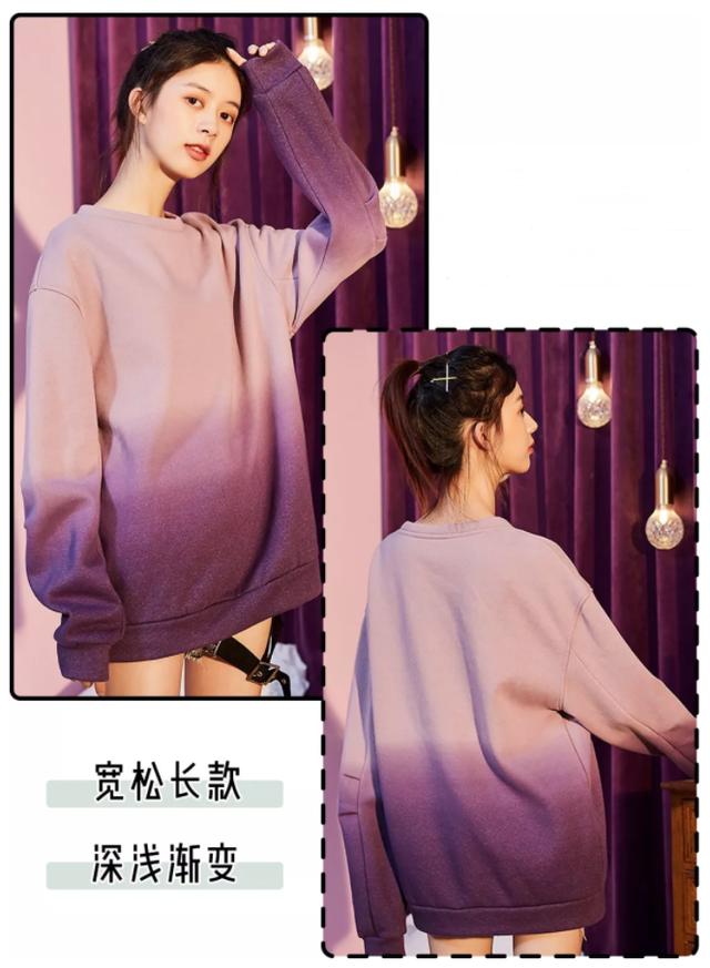 这种渐变色也是去年开始非常流行的,由深到浅逐渐递进,非常有设计感,紫色也不怎么挑人,穿起来率性又时髦,还能利用oversize的款式来打造“下半身失踪”,性感又清新。