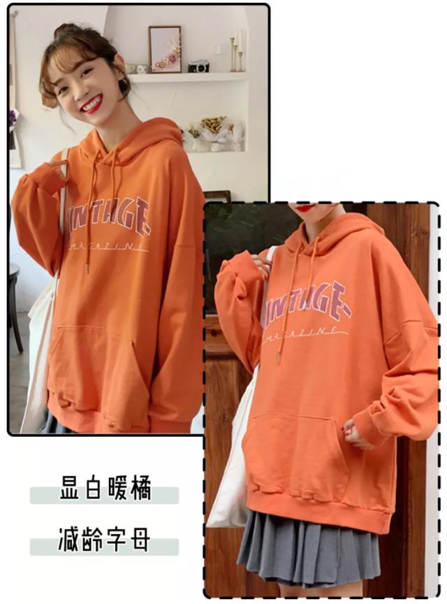 橙色相对来说也不怎么挑人,也是最为常见的一种颜色,这种字母印花的连帽卫衣,版型宽松,穿着非常舒适又慵懒,如果再涂上一个红色的口红,也非常搭配,减龄又少女。