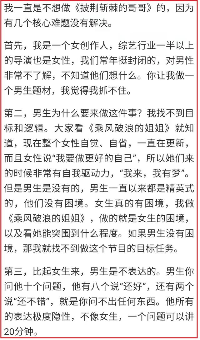 尽管两季《乘风破浪的姐姐》都很成功,但是吴梦知说自己一直不想做《哥哥》这档节目,因为有三个问题核心问题没解决。