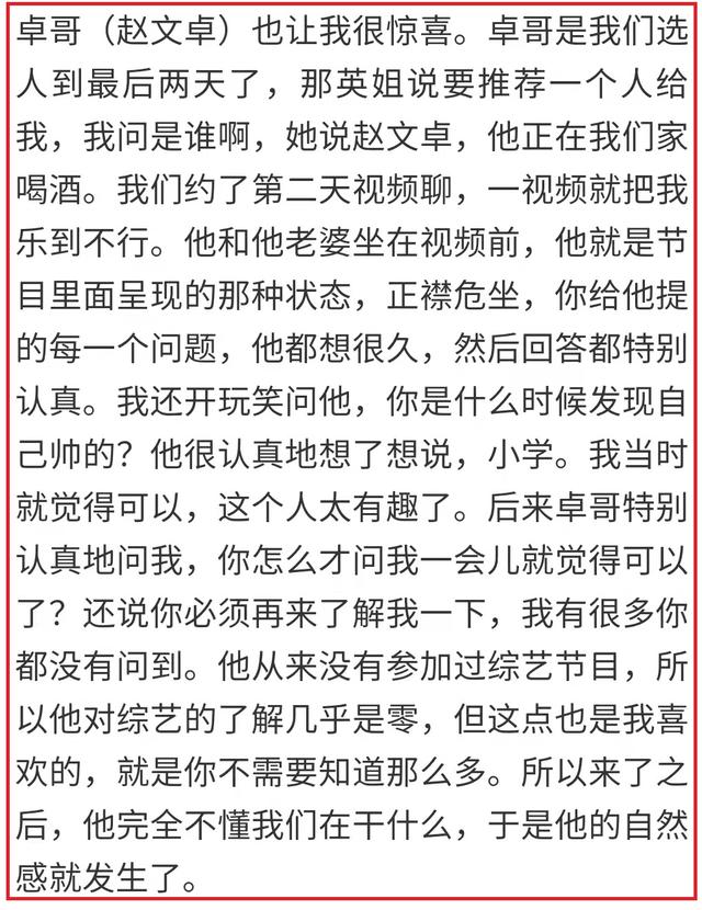 吴梦知和赵文卓夫妇视频见面时,赵文卓正襟危坐,和节目中表现出来的状态一模一样,他这种综艺小白正好是吴梦知需要的嘉宾,而事实证明双方都没有信错人。