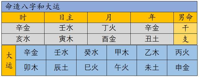 再见时柱又是辛金、亥水,亥水为壬水之禄旺强根,再得辛金之生,此时壬水命已经生旺太过了。又见年柱辛金、丑土,酉丑半合金局,使得命中印星辛金再见强旺,便成印(金)旺、身(壬水日主)强之象。
