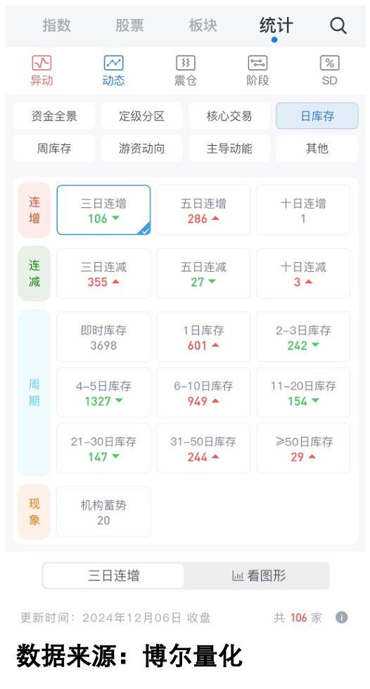 从图中可以看出,「机构库存」数据目前快速增加中,但真正值得我们关注的,其实是「机构库存」数据已经持续一段时间的个股,比如10天以上有机构资金参与的,而这个数量,目前看还是凤毛麟角,这是大家需要重视的。