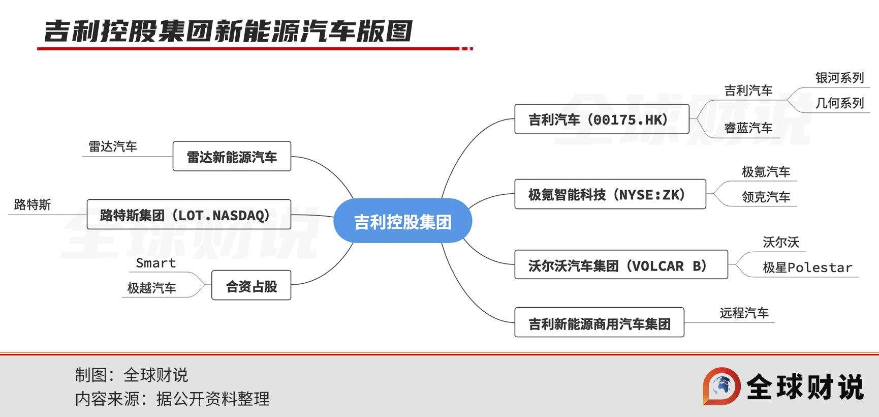 从上图可以看到,这12个品牌来自吉利控股集团的七个“儿子”,分别是:吉利汽车(00175. HK)、极氪智能科技(NYSE: ZK)、沃尔沃汽车集团(VOLCAR B)、吉利新能源商用汽车集团、雷达新能源汽车、路特斯集团(LOT. NASDAQ)和包含极越在内的合资占股公司。