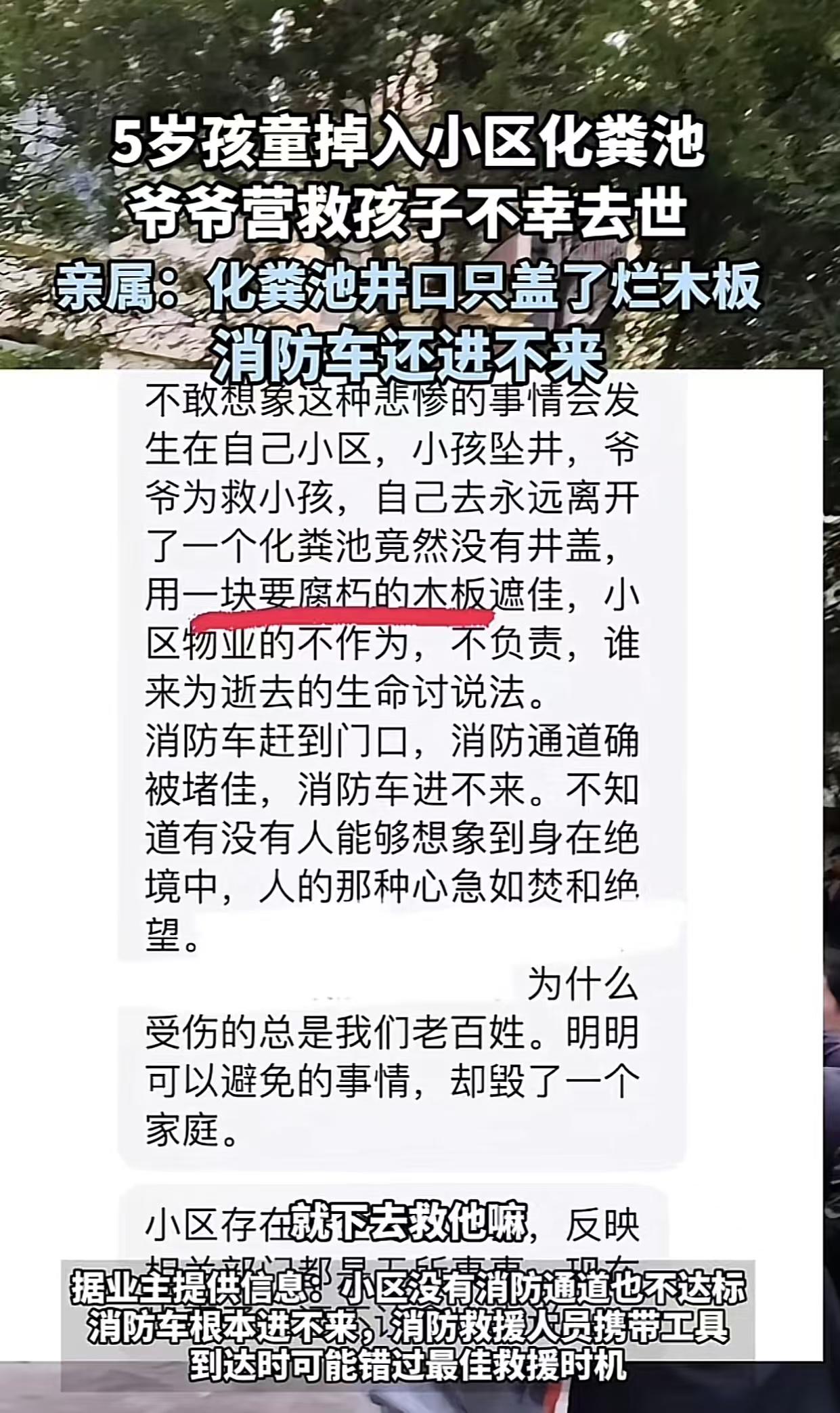 对于这件事情,亲属也是联系了记者发声。亲属表示化粪池井口只盖了烂木板,而且消防车当时还进不来小区。就是小区没有消防通道,导致消防员没有第一时间进来耽误了救援时间。也能看得出来亲属很悲痛,这件事情小区物业确实有不可推脱的责任。而每次发生这种事情的时候,物业最多就承担点赔偿责任,而亲属就得承受失去亲人的痛苦。