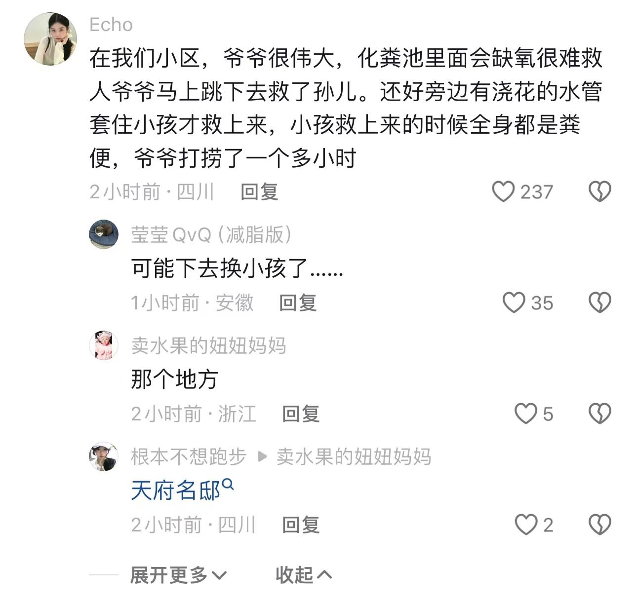 孩子掉下去的时候,70多岁的爷爷就在边上看到了这一幕。看到孩子掉进化粪池里危在旦夕,爷爷顾不得自己的命当场就跳下去了营救。要知道化粪池里面都是沼气,人下去一分钟可能就窒息了。但根据目击者描述,那爷爷真的很伟大,真的是用尽全力去救。就还好旁边浇花那有水管,最终爷爷用水管套住了孩子才把孩子救了上来。孩子救上来的时候全身都是粪便,但爷爷因为窒息就倒了下去。据说后面是打捞了一个多小时,才把爷爷遗体打捞上来。
