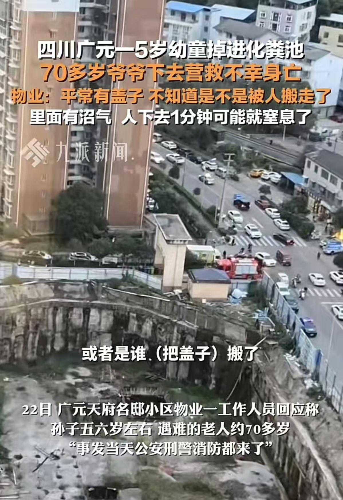 都说父母的爱是伟大的,但爷爷奶奶的爱也同样伟大。这不10月22日,媒体们就报道了这件事情。在四川广元一小区,有一个5岁幼童玩耍的时候不小心掉入了化粪池。本来化粪池是不可能掉进去的,物业也表示平常都有盖子的,可能当时盖子被人搬走了。再加上5岁的孩子哪里懂什么危险性,结果一不小心就掉了下去。