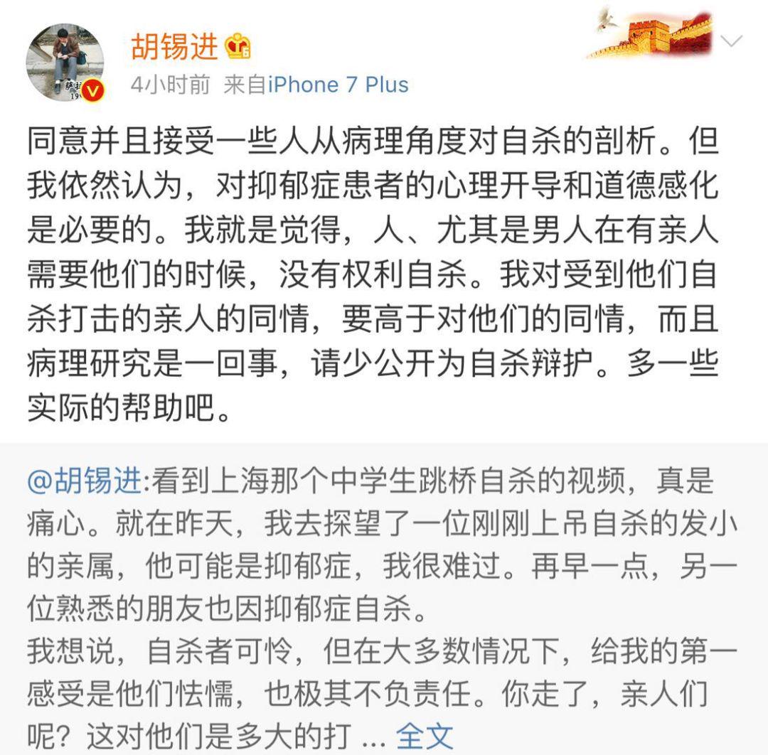 胡锡进认为,社会应当加强对自杀现象的研究,尽最大努力防止自杀的发生。